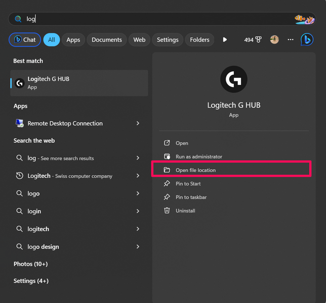 Σημείωμα:Εάν έχετε εγκατεστημένη την εφαρμογή Logitech G Hub σε διαφορετική μονάδα εκτός από τη μονάδα C, μπορείτε να χρησιμοποιήσετε τη γραμμή αναζήτησης στο File Explorer για να την εντοπίσετε.