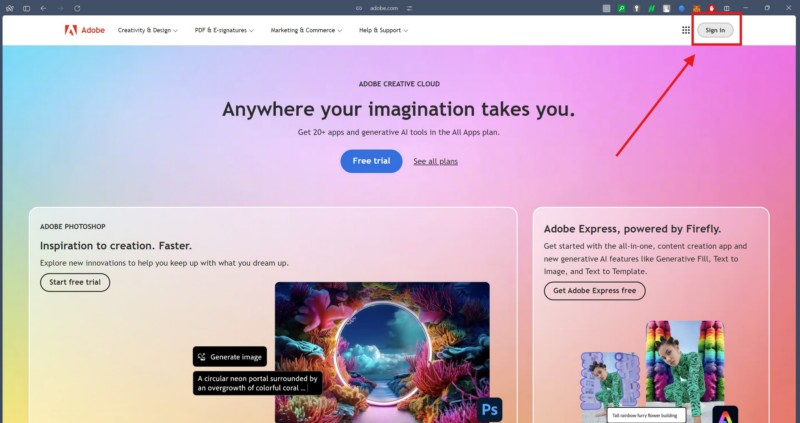 2.Στην αρχική σελίδα της Adobe, κάντε κλικ στοΚουμπί σύνδεσηςΣτην επάνω δεξιά γωνία της σελίδας.