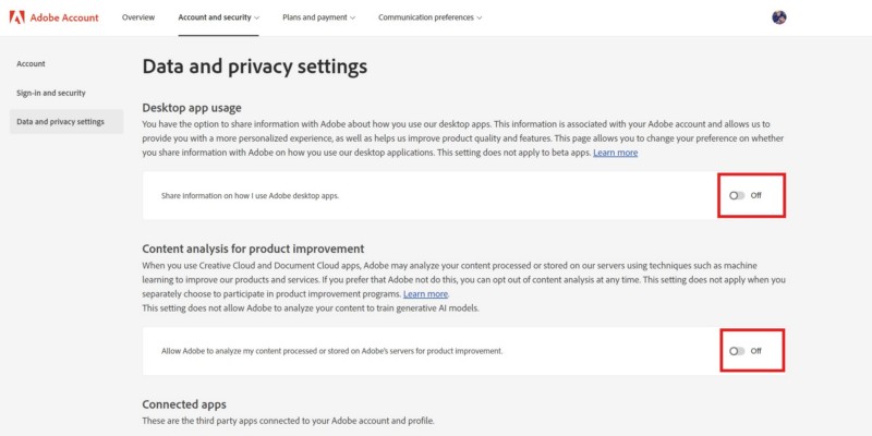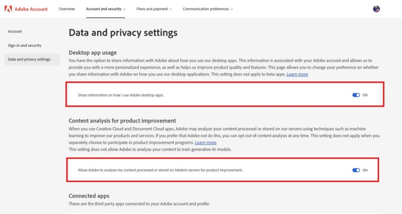 7.Στην επόμενη σελίδα, θα βρείτε τις εναλλαγές γιαΜοιραστείτε πληροφορίες σχετικά με τον τρόπο με τον οποίο είμαι εφαρμογές επιφάνειας εργασίας AdobeκαιΕπιτρέψτε στο Adobe να αναλύσει το περιεχόμενό μου που έχει επεξεργαστεί ή αποθηκεύεται στους διακομιστές της Adobe για βελτίωση προϊόντωνΟι επιλογές είναιενεργοποιημένος. Αυτό σημαίνει ότι μοιράζεστε τα δεδομένα χρήσης των εφαρμογών Adobe με τους διακομιστές της Adobe.