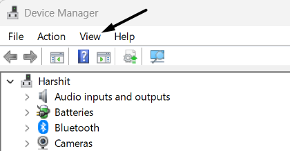 1.Ανοίγω τοΔιαχειριστής συσκευώνστο υπολογιστή σας Windows 11 και κάντε κλικ στο κουμπίΘέαΣτο επάνω μενού κορδέλας.