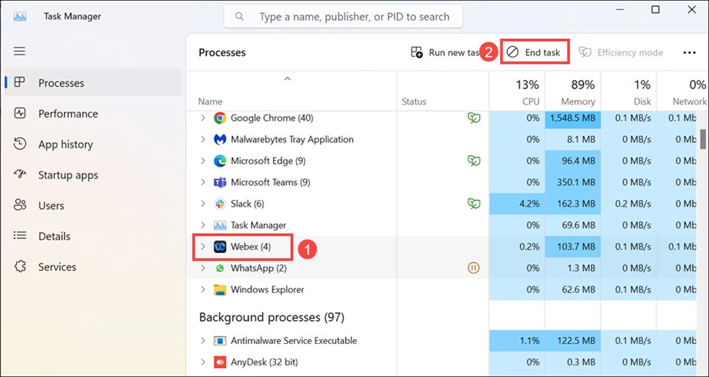 Μερικές φορές, η Cisco Webex μπορεί να αντιμετωπίσει προσωρινά ζητήματα που μπορούν να επιλυθούν με την επανεκκίνηση της εφαρμογής από τον διαχειριστή εργασιών.