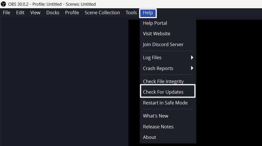 Μπορείτε επίσης να αναζητήσετε νέαΕνημερώσεις για το πρόγραμμα στούντιο OBSκαι στη συνέχεια εγκαταστήστε τα για να απαλλαγείτε από αυτό το πρόβλημα. Αυτό οφείλεται στο γεγονός ότι θα μπορούσε να είναι δυνατή η τρέχουσα έκδοση της εφαρμογής του OBS Studio έχει κάποια βραχυπρόθεσμα σφάλματα, τα οποία προκαλούν αυτό το ζήτημα. Επομένως, ενημερώστε την εφαρμογή του Obs Studio ακολουθώντας τα παρακάτω βήματα στο Windows 11 PC:
