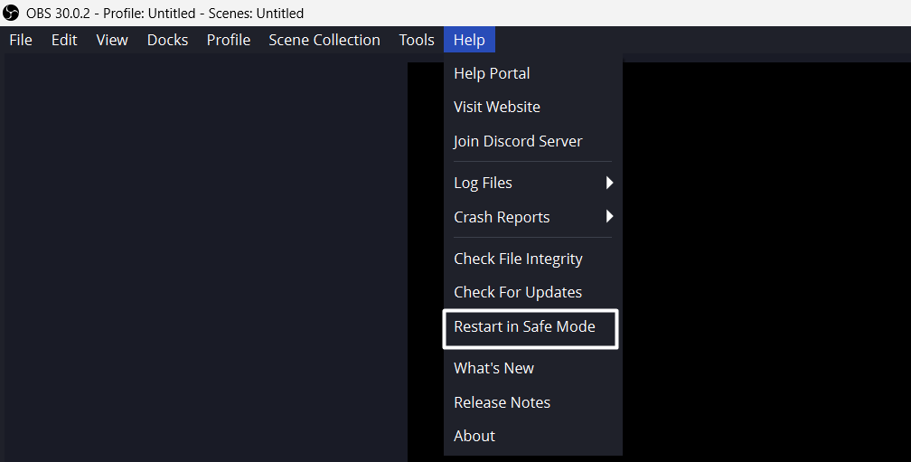 1.Στο επάνω μενού του Obs Studio, επιλέξτε τοΒοήθειαεπιλογή και μετάΕπανεκκίνηση σε ασφαλή λειτουργία.