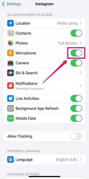 Τώρα, αν διαπιστώσετε ότι το μικρόφωνο του iPhone σας δεν λειτουργεί μέσα σε μια εφαρμογή τρίτου μέρους όπως το WhatsApp, το Instagram, το Facebook ή άλλες παρόμοιες εφαρμογές, οι πιθανότητες είναι ότι η εφαρμογή δεν έχει πρόσβαση στο μικρόφωνο.