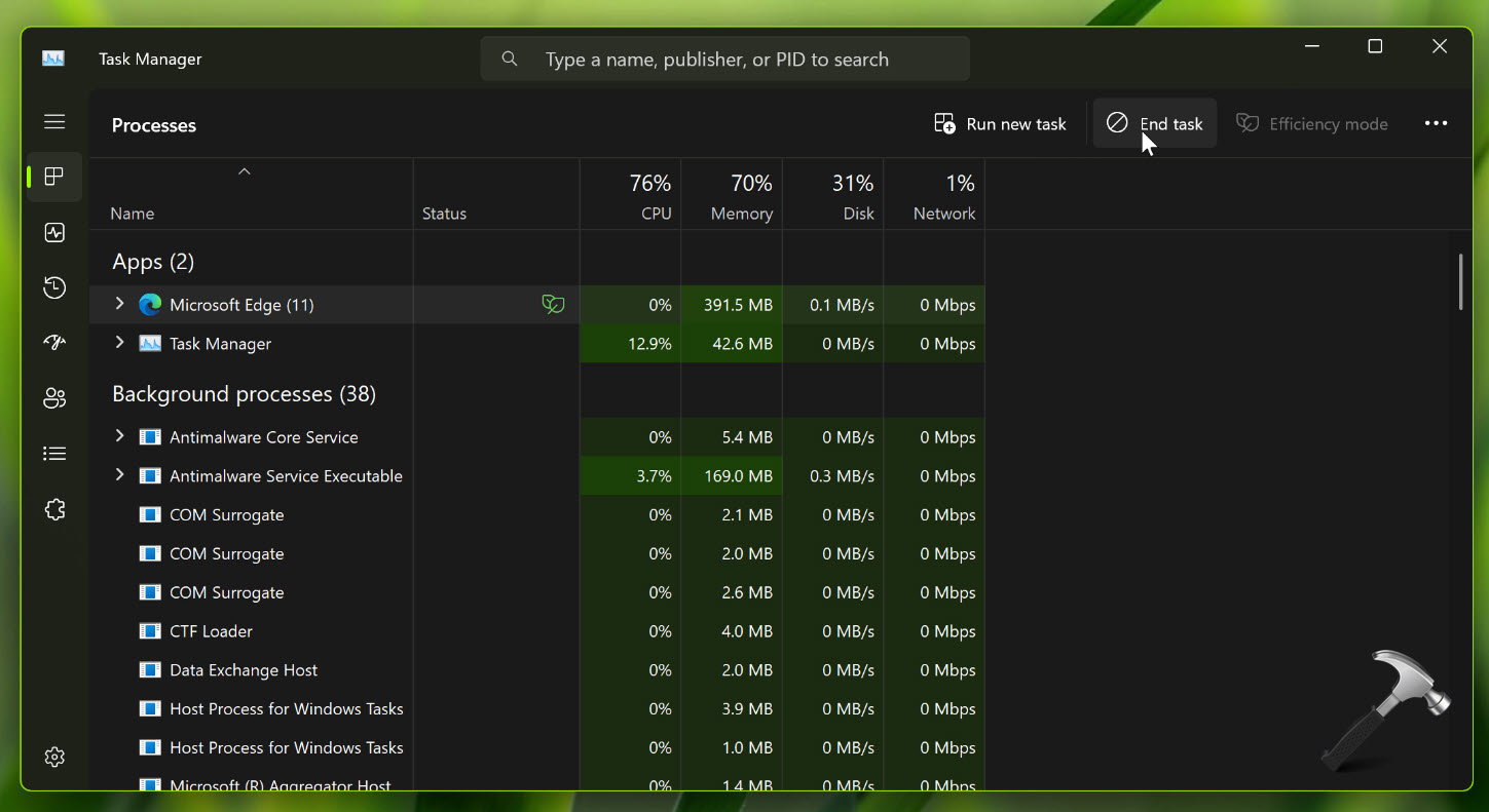 Ανοίξτε τον διαχειριστή εργασιών, εντοπίστε τη διαδικασία της Microsoft Edge. Συνήθως έχει και πολλές υποτομές. Μπορείτε να επισημάνετε τη διαδικασία της Microsoft Edge και κάντε κλικ στο κουμπί End Task. Στη συνέχεια, ανοίξτε ξανά το πρόγραμμα περιήγησης Microsoft Edge.