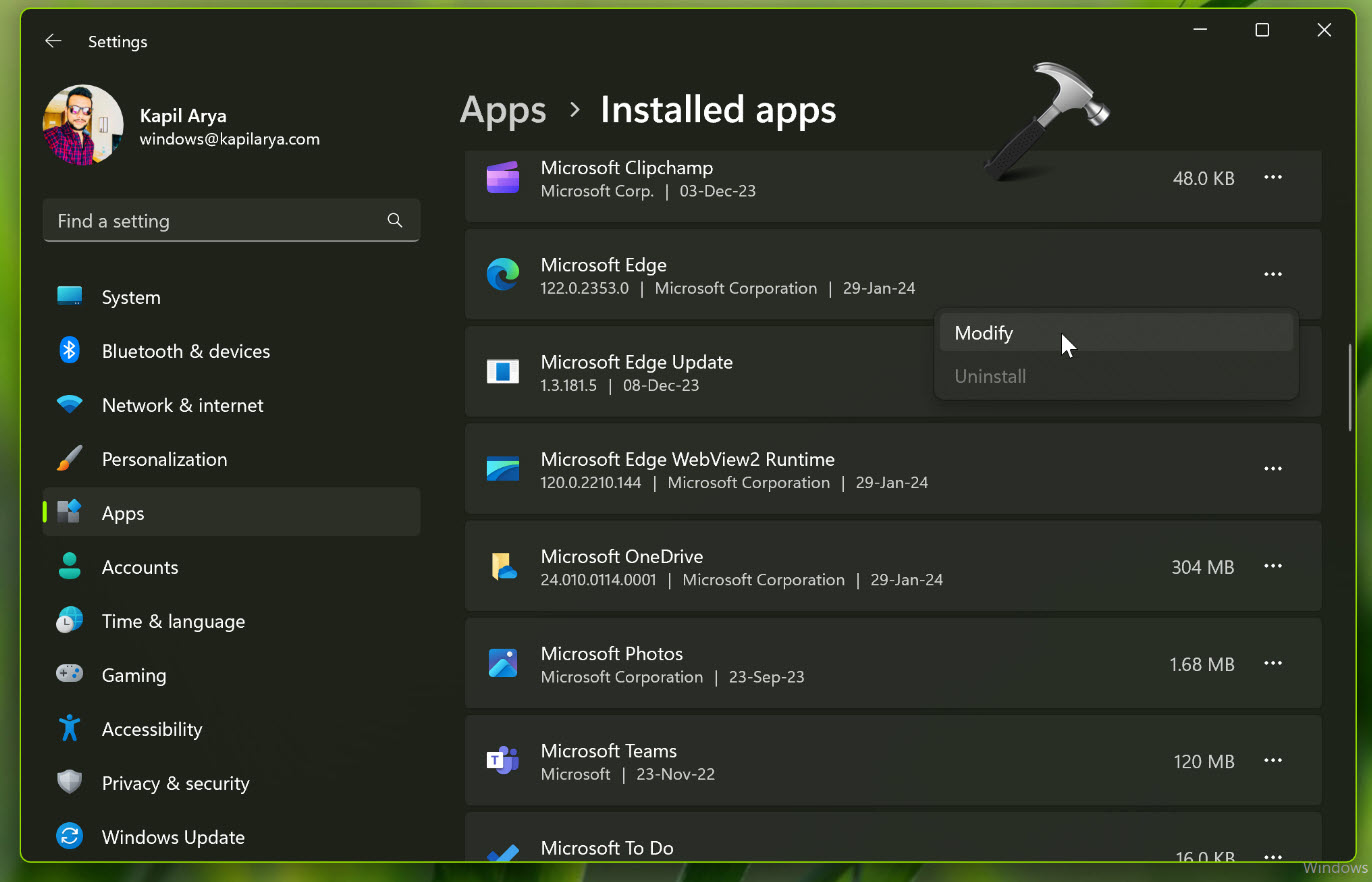 Εντοπίστε το Microsoft Edge σε αυτή τη λίστα, κάντε κλικ σε τρεις κουκίδες δίπλα σε αυτό και επιλέξτε Τροποποίηση.