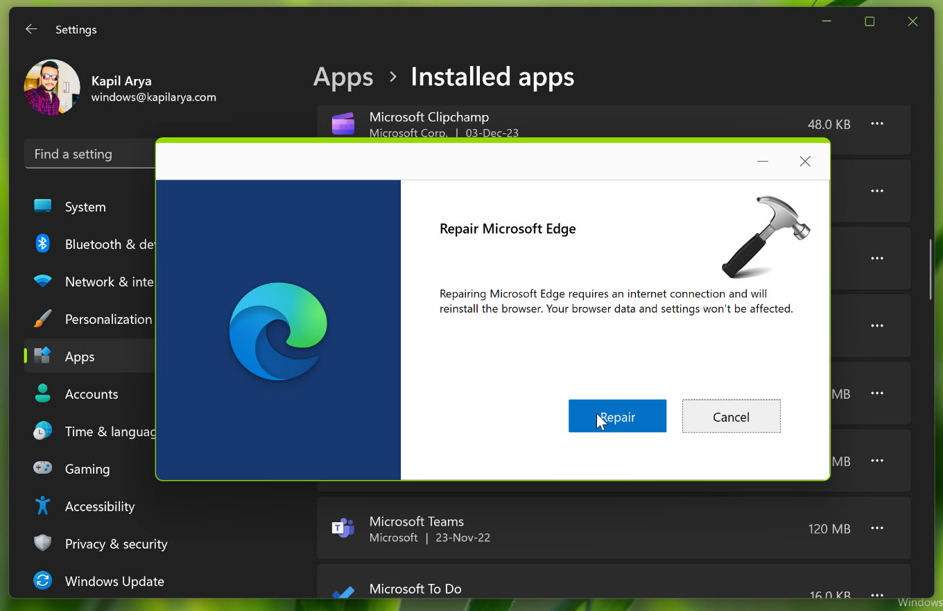 Τώρα εμφανίζεται το παράθυρο επισκευής Microsoft Edge. Λέει ότι πρέπει να συνδεθείτε στο Διαδίκτυο για να ξεκινήσετε αυτή τη διαδικασία επισκευής, οπότε βεβαιωθείτε ότι είστε συνδεδεμένοι στο Διαδίκτυο. Απλά κάντε κλικ στο κουμπί επισκευής και μόλις πατήσετε το κουμπί επισκευής, η Microsoft Edge θα μεταφορτωθεί ξανά και θα εγκατασταθεί.