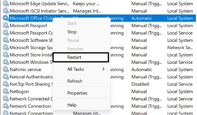 Microsoft Office Click-To-Run3.Κάντε δεξί κλικ σε αυτήν την υπηρεσία και επιλέξτεΕπανεκκίνησηήΦρεσκάρωαπό το μενού για να επανεκκινήσετε την επιλεγμένη υπηρεσία.