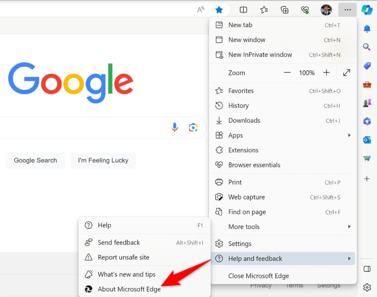 - Επιλέξτε τις τρεις τελείες στοΑκρη'S πάνω από δεξιά γωνία και επιλέξτεΒοήθεια και σχόλια>Σχετικά με τη Microsoft Edge.