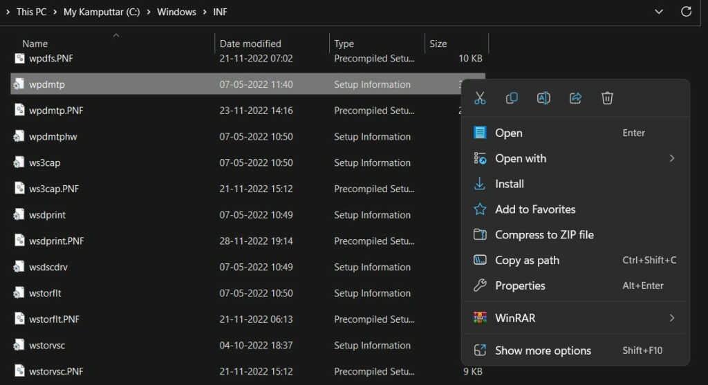 2.Αναζητήστε ένα αρχείο που ονομάζεταιWPDMTP.Μόλις βρεθεί, κάντε δεξί κλικ στο αρχείο και χρησιμοποιήστε τοεγκαθιστώκουμπί για να εκτελέσετε μια χειροκίνητη εγκατάσταση.