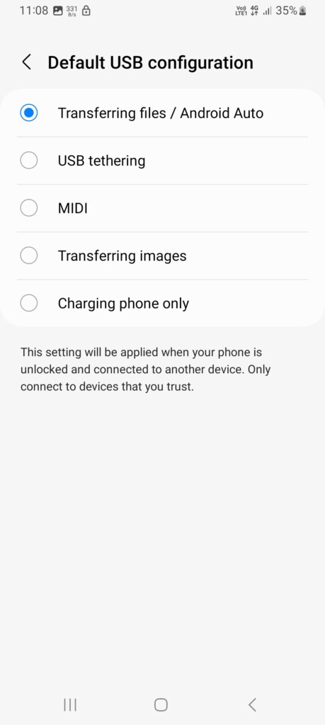 Σε μερικά smartphones, αυτή η ρύθμιση USB επαναφέρεται κάθε φορά που αποσυνδέετε το τηλέφωνο από τον υπολογιστή, οπότε αν το smartphone σας το κάνει και να ακολουθήσετε αυτά τα βήματα για να κάνετεΜεταφορά αρχείων/ ANDROID AUTOτην προεπιλεγμένη επιλογή για σύνδεση USB.