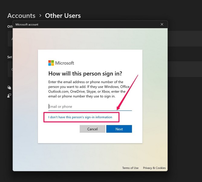 4.Μόλις ανοίξει η γραμμή σύνδεσης, κάντε κλικ στοΔεν έχω πληροφορίες σύνδεσης αυτού του ατόμουεπιλογή.