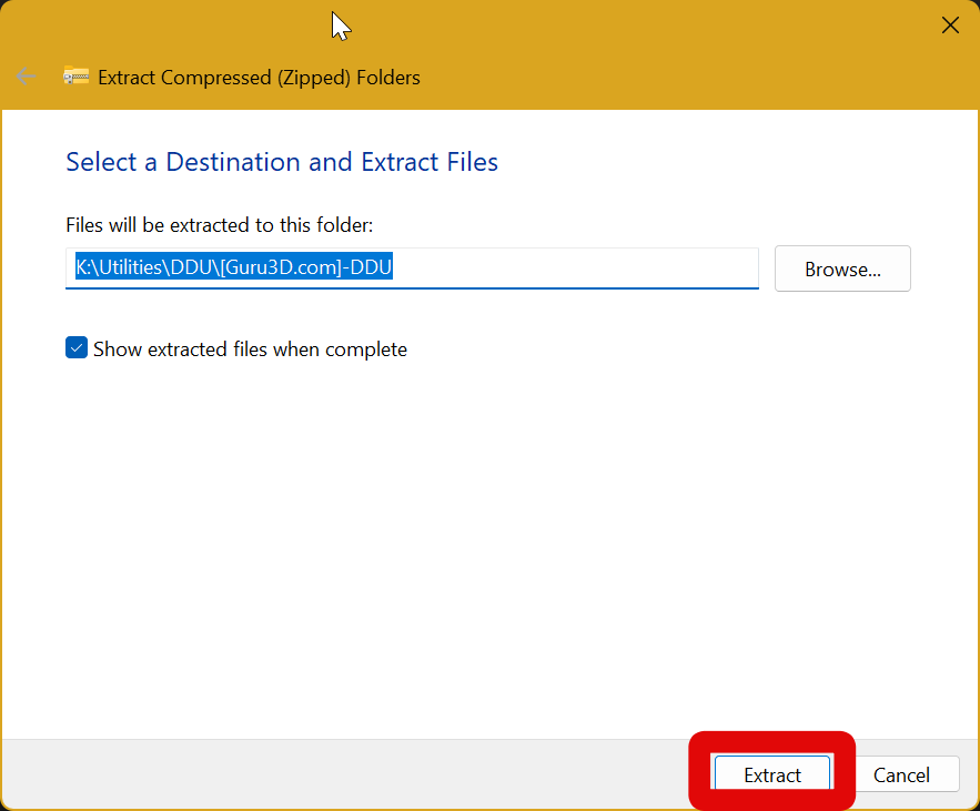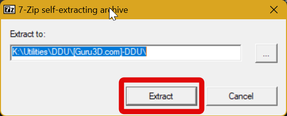 3.ΚλικΕκχύλισμα. Αυτό θα εξαγάγει το αρχείο στην ίδια θέση. Ο εξαγόμενος φάκελος θα ανοίξει αυτόματα μόλις ολοκληρωθεί η διαδικασία. Μόλις εξαγάγετε, κάντε διπλό κλικ και ξεκινήστε το αρχείο ddu.exe, το οποίο θα πρέπει επίσης να έχει την τρέχουσα έκδοση που περιλαμβάνεται στο όνομα του αρχείου.