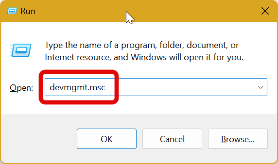 2.Μόλις ανοίξει η εφαρμογή εκτέλεσης, πληκτρολογήστε το devmgmt.msc και πατήστε Enter στο πληκτρολόγιό σας. Μπορείτε επίσης να κάνετε κλικ στοΕΝΤΑΞΕΙΕάν προτιμάτε.
