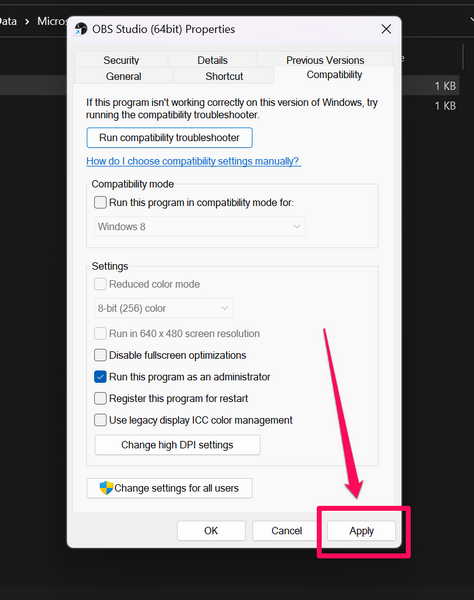 2. Διαμορφώστε το Obs Studio για να εκτελεστεί ως διαχειριστής στα Windows 11