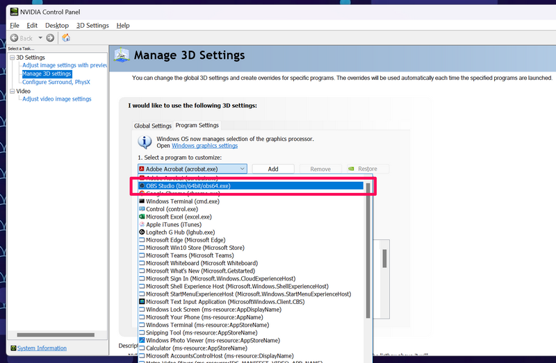 Σε αυτή την περίπτωση, μπορείτε να διαμορφώσετε την εφαρμογή Obs Studio για να εκτελέσετε την ειδική GPU του υπολογιστή σας Windows 11 ή στο φορητό υπολογιστή σας και να διορθώσετε το εν λόγω ζήτημα. Έχουμε επιδείξει τα παρακάτω βήματα διαμορφώνοντας την εφαρμογή Obs Studio για να εκτελέσετε μια GPU NVIDIA μέσω του μενού ρυθμίσεων NVIDIA. Έτσι, εάν έχετε GPU NVIDIA ως ειδική κάρτα γραφικών στη συσκευή σας Windows 11, ακολουθήστε τα βήματα παρακάτω για να διαμορφώσετε την εφαρμογή του Obs Studio για να εκτελέσετε την ειδική GPU: