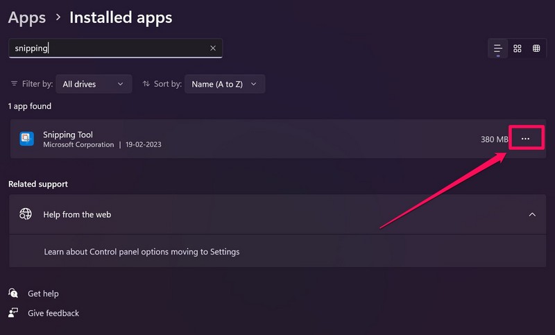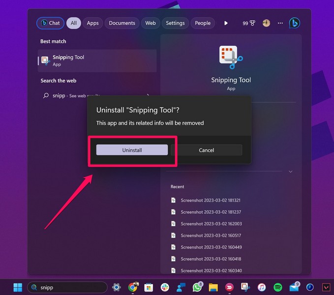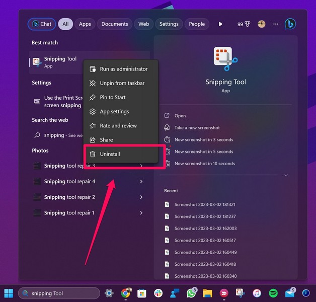 3. Ακολουθήστε τις οδηγίες στην οθόνηΓια να απεγκαταστήσετε την εφαρμογή εργαλείου Snipping από τη συσκευή Windows 11.