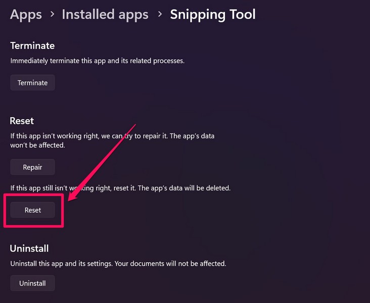 Το επόμενο πράγμα που μπορείτε να δοκιμάσετε όταν η λειτουργία εγγραφής οθόνης στο εργαλείο Snipping δεν λειτουργεί είναι να επισκευάσετε και/ ή να επαναφέρετε την εφαρμογή. Ακολουθήστε τα βήματα παρακάτω για να επισκευάσετε την εφαρμογή εργαλείου Snipping στα Windows 11: