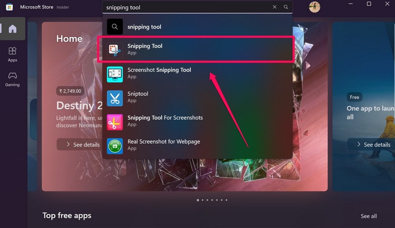 4.Μετά την απεγκατάσταση,Ανοίξτε το κατάστημα της Microsoftκαι χρησιμοποιήστε τη γραμμή αναζήτησης για να βρείτε την εφαρμογή εργαλείου Snipping.