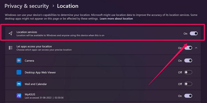 Για να ενεργοποιήσετε την ανίχνευση τοποθεσίας στον υπολογιστή σας Windows 11 ή στο φορητό υπολογιστή σας, μεταβείτε στη ρύθμιση τοποθεσίας κάτω από την καρτέλα Προστασία Προσωπικών Δεδομένων και Ασφάλεια στην εφαρμογή Ρυθμίσεις των Windows και ενεργοποιήστε την εναλλαγή για την επιλογή Υπηρεσιών Τοποθεσίας.