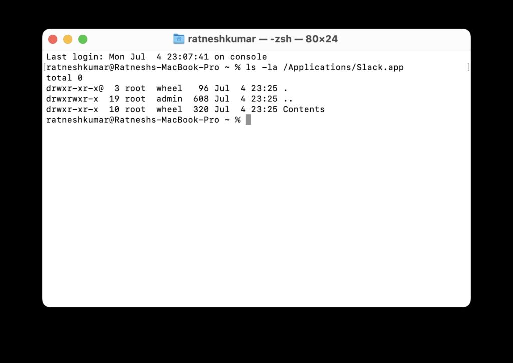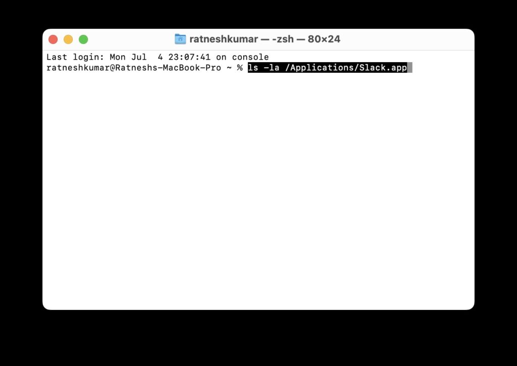 3.Στο παράθυρο τερματικού, πληκτρολογήστεls -la /appications/slack.appκαι χτύπημαΕισάγω.