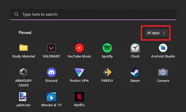 1.Τύποςη νίκηΠλήκτρο για να ανοίξετε το μενού Έναρξη στον υπολογιστή σας και κάντε κλικ στο κουμπίΌλες οι εφαρμογές.