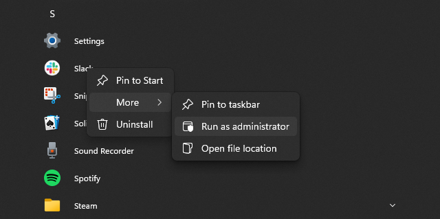 2.Τώρα μετακινηθείτε προς τα κάτω και αναζητήστε Slack. Μόλις το βρείτε, κάντε δεξί κλικ στο όνομα, κάντε κλικ στο κουμπίπερισσότερο, και στη συνέχεια επιλέξτε τοΕκτελέστε ως διαχειριστήςεπιλογή.