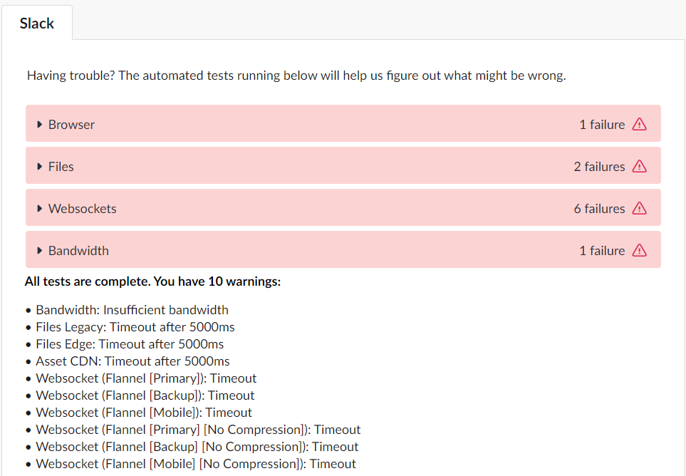 2.Θα ανοίξει την ιστοσελίδα για τον έλεγχο της σύνδεσής σας με το Slack. Η ιστοσελίδα θα δοκιμάσει τα πάντα, συμπεριλαμβανομένου του προγράμματος περιήγησής σας, των αρχείων, των websockets και του εύρους ζώνης, και τελικά, θα σας δείξει τα προβλήματα, αν υπάρχουν.