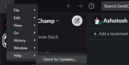 2.Τώρα, κάντε κλικ στοβοήθειακαι επιλέξτε τοΕλέγξτε για ενημερώσειςΕπιλογή για προβολή και λήψη της τελευταίας έκδοσης του Slack.