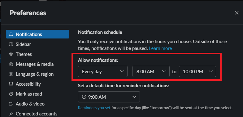 3.Επιπλέον, εάν δεν αντιμετωπίζετε προβλήματα ειδοποιήσεων μόνο μετά από μια συγκεκριμένη ώρα της ημέρας, μετακινηθείτε προς τα κάτω και προσαρμόστε την ώρα έναρξης και λήξης των ειδοποιήσεων στο πλαίσιο τουΧρονοδιάγραμμα ειδοποίησηςτμήμα.