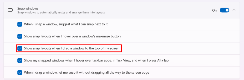 3.Τέλος, ελέγξτε τοΕμφάνιση διατάξεων snaps όταν σύρετε ένα παράθυρο στην κορυφή της οθόνης μουπλαίσιο ελέγχου.