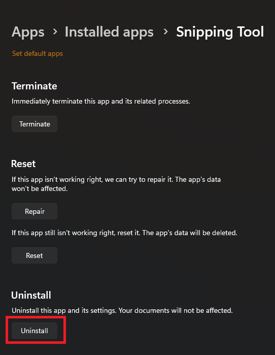 Τώρα, το πρόβλημα είναι πιθανό με τα αρχεία συστήματος της εφαρμογής Snipping Tools. Εάν καταργήσετε την εφαρμογή από το σύστημά σας και στη συνέχεια εγκαταστήστε ξανά, θα αντικαταστήσετε όλα τα κατεστραμμένα και εσφαλμένα αρχεία με φρέσκα, καθιστώντας σωστά την εφαρμογή εργαλείου Snipping. Δείτε πώς μπορείτε να το κάνετε: