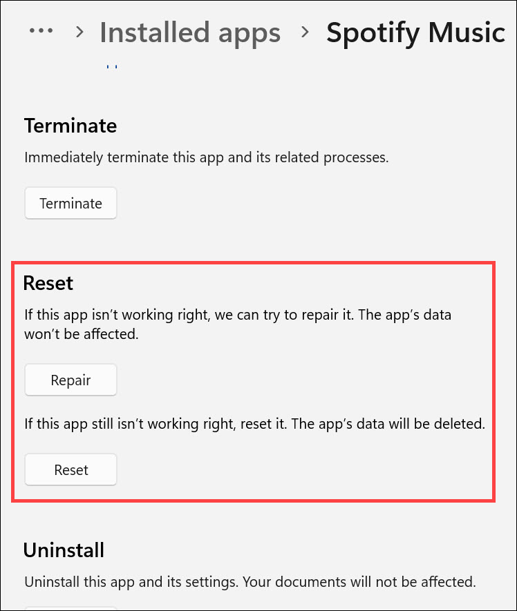 4.Κάτω από τις προχωρημένες επιλογές, πρώτα, κάντε κλικ στοΕπισκευήκουμπί κάτω από την επικεφαλίδα "επαναφορά". Εάν το Spotify δεν λειτουργεί ακόμα, κάντε κλικ στοΕπαναφοράκουμπί στη συνέχεια.