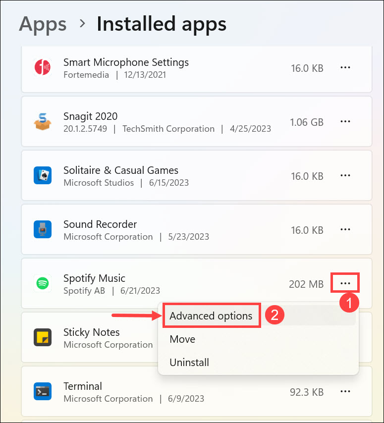 3.Μετακινηθείτε στη λίστα των εγκατεστημένων εφαρμογών, εντοπίστεΜουσική spotify, κάντε κλικ στις τρεις κουκκίδες και επιλέξτεΠροχωρημένες επιλογές.