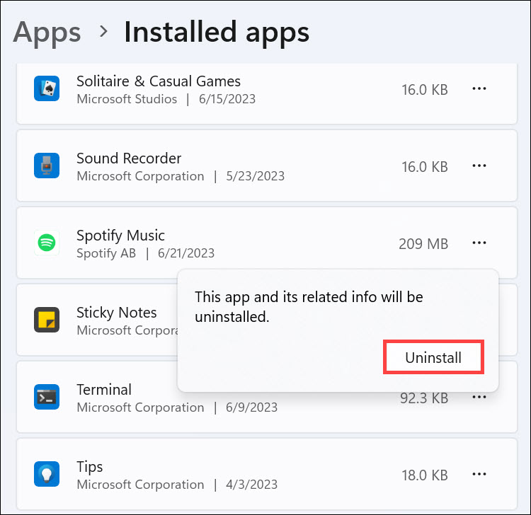 3.Μετακινηθείτε στη λίστα των εγκατεστημένων εφαρμογών, εντοπίστεΜουσική spotify, κάντε κλικ στις τρεις κουκκίδες και επιλέξτεΑπεγκαθιστώ.