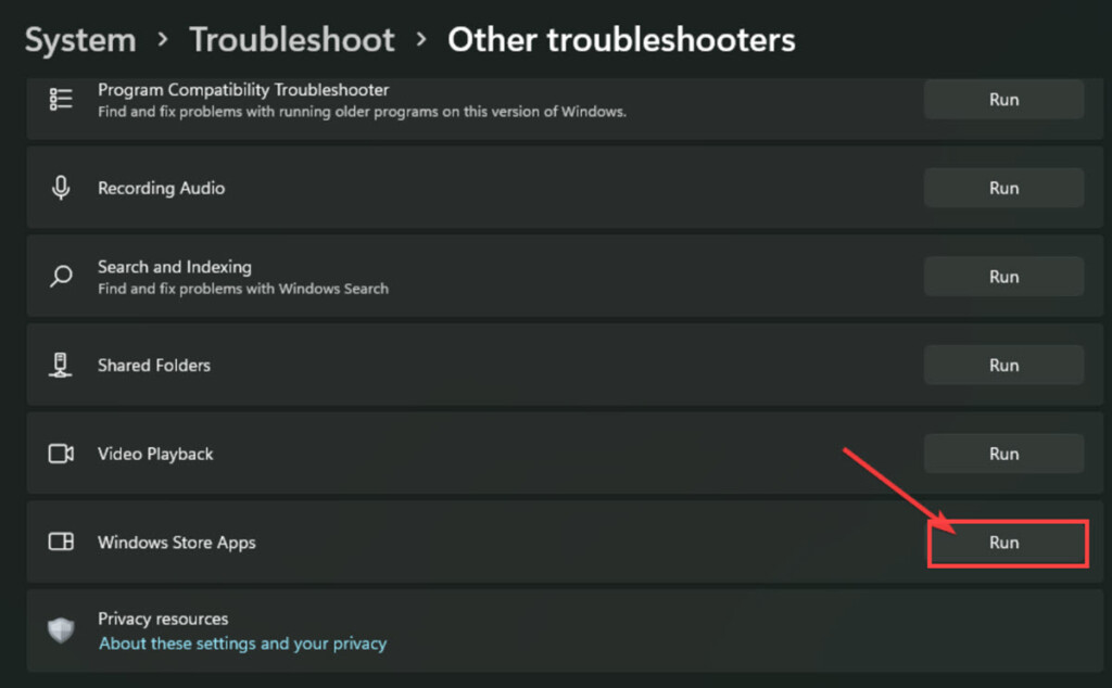 Εάν το Spotify εξακολουθεί να μην λειτουργεί όπως αναμένεται στα Windows 11, η εκτέλεση των προβλημάτων "Apps Windows Store" μπορεί να σας βοηθήσει να εντοπίσετε και να διορθώσετε τυχόν προβλήματα που σχετίζονται με την εφαρμογή. Αυτός ο ενσωματωμένος αντιμετώπιση προβλημάτων μπορεί να ανιχνεύσει και να επιλύσει αυτόματα προβλήματα που ενδέχεται να επηρεάσουν τη λειτουργικότητα του Spotify. Δείτε πώς να το εκτελέσετε: