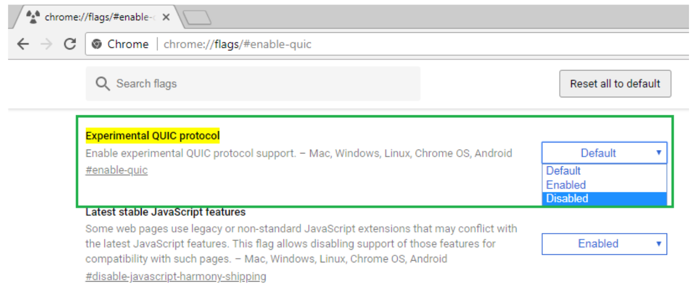 - Το πρωτόκολλο QUIC θα είναι πάντα ρυθμισμένο σε "προεπιλογή". Αλλάξτε αυτή τη ρύθμιση σε "απενεργοποιημένη".