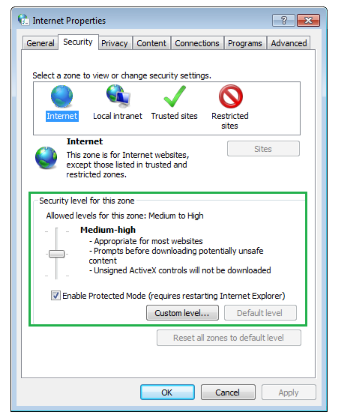 - Στο "Ιδιότητες Internet"> μεταβείτε στην "ασφάλεια" και ελέγξτε το ρυθμιστικό. Εάν ο ρυθμιστής βρίσκεται σε υψηλή κλίμακα, χαμηλώστε το και τοποθετήστε το στη μεσαία θέση. Αργότερα, κάντε κλικ στο OK για να αποθηκεύσετε αλλαγές.