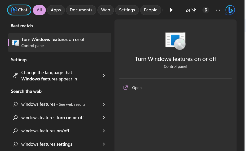 Βήμα 2: Πληκτρολογήστε "Χαρακτηριστικά των Windows" στη γραμμή αναζήτησης ή ξεκινήστε να πληκτρολογείτε απευθείας στο μενού Έναρξης. Από τα αποτελέσματα αναζήτησης, κάντε κλικ στην επιλογή "Ενεργοποίηση ή απενεργοποίηση".