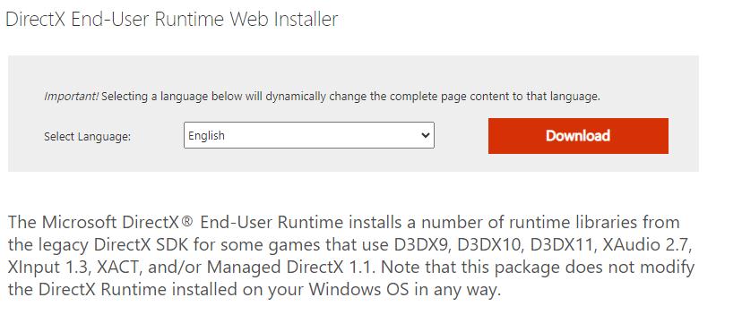 Αυτό το ζήτημα σχετίζεται με το API DirectX επειδή το DirectDraw είναι ένα στοιχείο του. Επειδή τα παιχνίδια Legacy χρησιμοποιούν παλαιότερες βιβλιοθήκες DirectX Runtime, οι οποίες μπορεί να μην υπάρχουν στον υπολογιστή σας, μπορεί να προκύψει σφάλμα. Χρησιμοποιώντας το πρόγραμμα εγκατάστασης ιστού DirectX End-User Runtime, μπορείτε να προσθέσετε τυχόν στοιχεία που λείπουν το DirectX ως εξής: