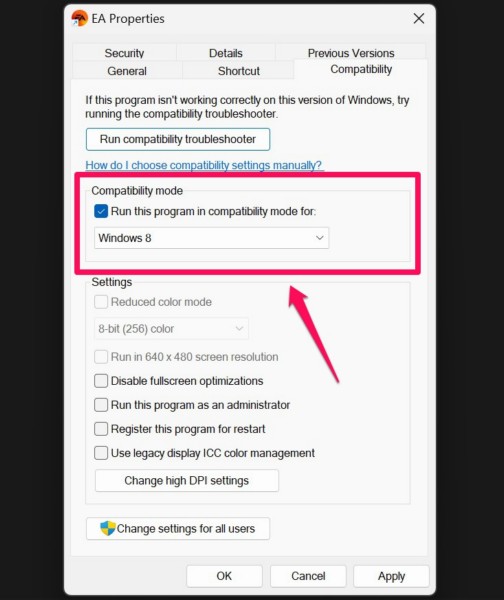 6. Εκτελέστε την εφαρμογή EA σε λειτουργία συμβατότητας στο Windows 11 PC ή Laptop