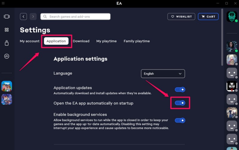 4.Πηγαίνετε στοΚαρτέλα εφαρμογήστην επόμενη σελίδα καιΒεβαιωθείτε ότι η εναλλαγήγια τοΑνοίξτε αυτόματα την εφαρμογή EA κατά την εκκίνησηΗ επιλογή είναιενεργοποιημένοςστο Windows 11 PC ή το φορητό υπολογιστή σας.