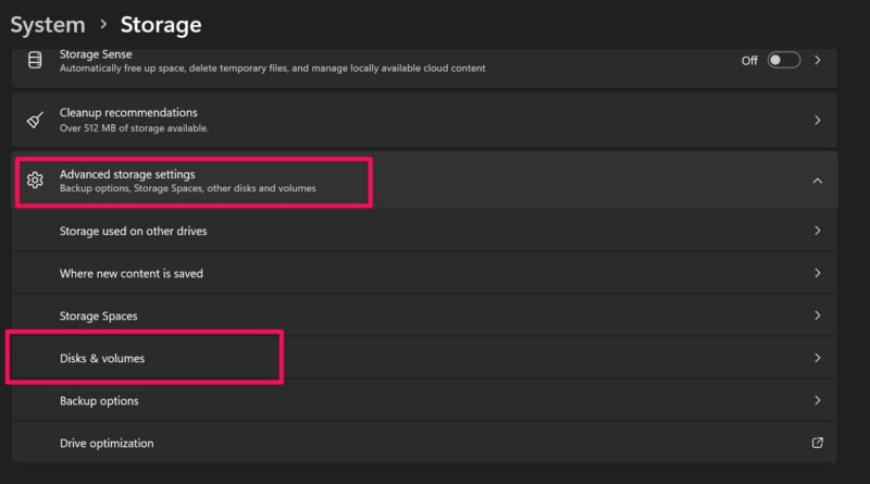 3.Επεκτείνω τοΠροηγμένες ρυθμίσεις αποθήκευσηςκαι κάντε κλικ στοΕπιλογή δίσκων & τόμων.