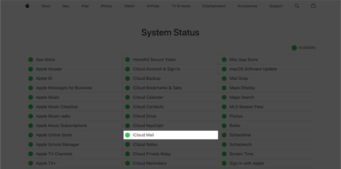 Για να βεβαιωθείτε ότι δεν συμβαίνει αυτό, μεταβείτεΟ επίσημος ιστότοπος κατάστασης του συστήματος της AppleΚαι ελέγξτε αν υπάρχει μια πράσινη κουκκίδα δίπλα στο Icloud Mail, υποδεικνύοντας ότι η υπηρεσία είναι σε λειτουργία.