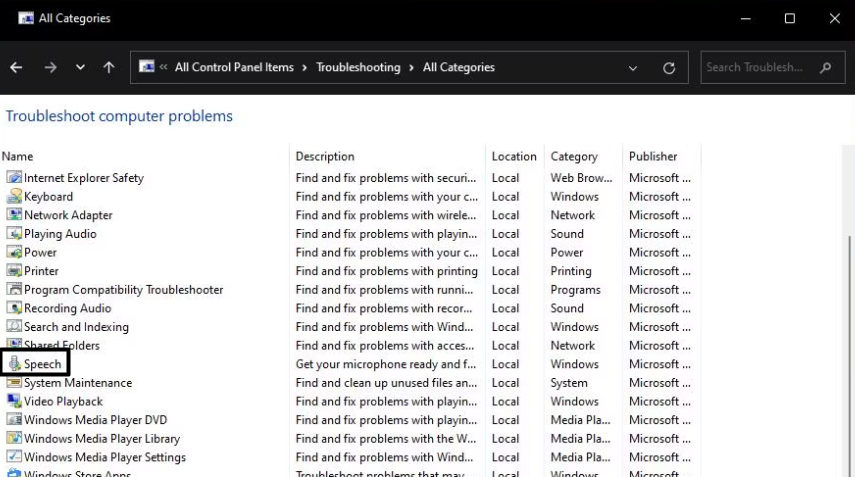 Εάν ο αντιμετώπιση προβλημάτων εγγραφής ήχου δεν διορθώνει τη φωνή που πληκτρολογεί το πρόβλημα εργασίας, δοκιμάστεΕκτέλεση του προβλημάτων ομιλίας. Η αντιμετώπιση προβλημάτων ομιλίας αναπτύσσεται κυρίως για να βρει και να διορθώσει θέματα που σχετίζονται με την ομιλία. Εκτελέστε το παραπάνω αντιμετώπιση προβλημάτων ακολουθώντας τα παρακάτω βήματα: