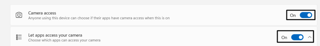 3.Στη συνέχεια, βεβαιωθείτε ότι τοΠρόσβαση κάμεραςκαιΑφήστε τις εφαρμογές να αποκτήσουν πρόσβαση στην εναλλαγή της φωτογραφικής μηχανής σαςείναι ενεργοποιημένο. Σημαίνει ότι άλλες εφαρμογές στο σύστημα μπορούν να χρησιμοποιήσουν την κάμερα.