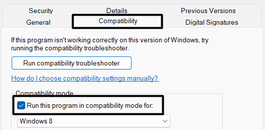 Σε ορισμένες περιπτώσεις, η επανεγκατάσταση των οδηγών σε κανονική λειτουργία δεν διορθώνει το πρόβλημα. Προτείνουμε λοιπόνΕπανατοποθετήστε τα προγράμματα οδήγησης κάμεραςΣε λειτουργία συμβατότητας. Σε αυτή τη λειτουργία, το σύστημα εκτελεί το πρόγραμμα χρησιμοποιώντας διαμορφώσεις από μια προηγούμενη έκδοση των Windows, η οποία μπορεί να διορθώσει το πρόβλημα. Ακολουθούν τα βήματα για την ενημέρωση των προγραμμάτων οδήγησης κάμερας σε προγράμματα οδήγησης συμβατότητας: