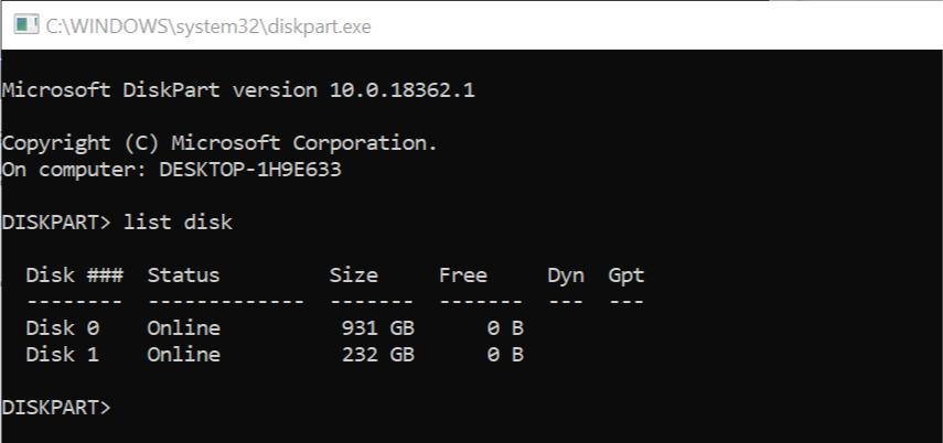 3. Τύπος δίσκου λίστας και πατήστε Enter. Αυτό θα εμφανίσει μια λίστα δίσκων που συνδέονται με τον υπολογιστή σας.