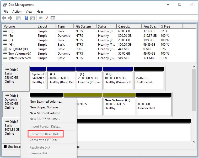 4. Μετά τη διαγραφή όλων των τόμων στον δυναμικό δίσκο, κάντε δεξί κλικ στον δυναμικό δίσκο και επιλέξτε "Μετατροπή σε βασικό δίσκο".