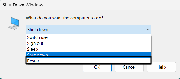 4.Χρησιμοποιήστε τοAlt + f4συντόμευση πληκτρολογίου για να ανοίξετε τοΚλείστε τα παράθυραΠροτροπή και επιλέξτεΕπανεκκίνησηαπό αυτό.